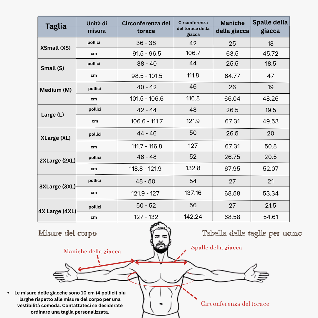 Basta comunicarci le tue misure corporee (larghezza spalle, circonferenza torace e lunghezza manica) tramite email o nella sezione “Dettagli ordine”.