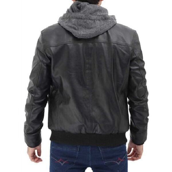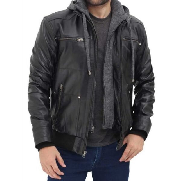 Giacca Bomber in Vera Pelle Nappa Nera con Cappuccio Rimovibile