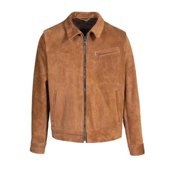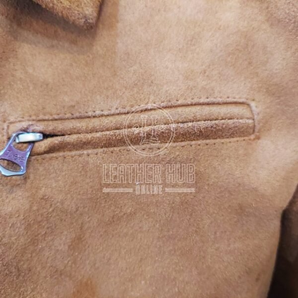 Questa giacca si distingue per l’uso di pregiata pelle di pecora pieno fiore scamosciata, che conferisce un tocco di lusso inatteso a un design iconico e robusto.