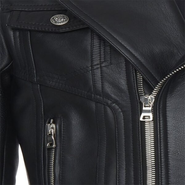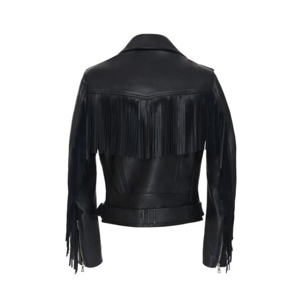 Questa giacca si distingue per la sua audace fusione di elementi classici da motociclista, come la cerniera asimmetrica e i revers a punta, con un’esplosione di frange dinamiche che adornano maniche, spalle e schiena. È una celebrazione dello stile che unisce l’eredità ribelle della strada con il fascino selvaggio del West, creando un capo che non passa inosservato e ti assicura una presenza glamour e uno stile impeccabile senza sforzo.