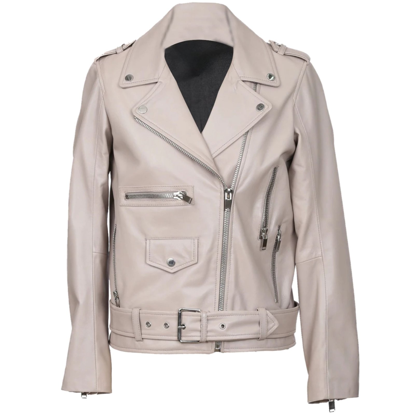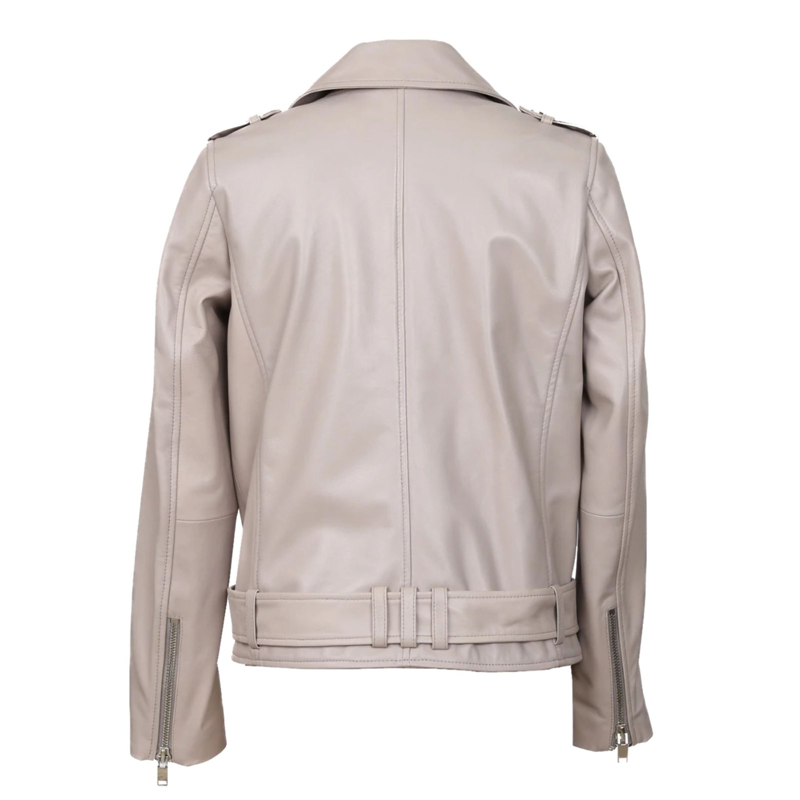 La pelle di pecora bianca pura e la finitura lussuosa reinterpretano il classico biker con un tocco di raffinatezza moderna e uno stile inconfondibile.