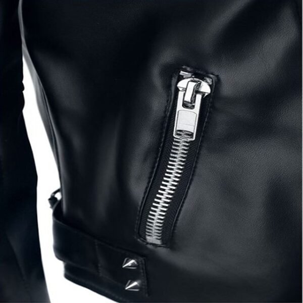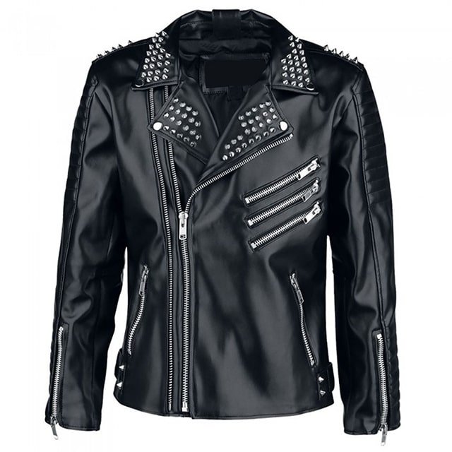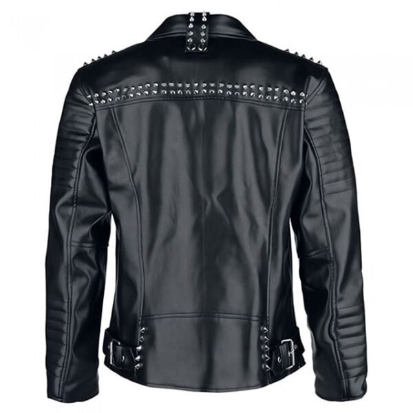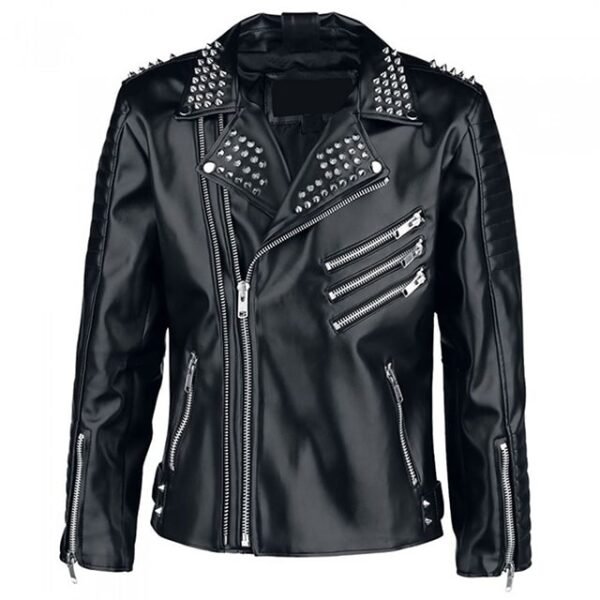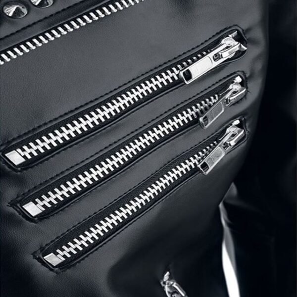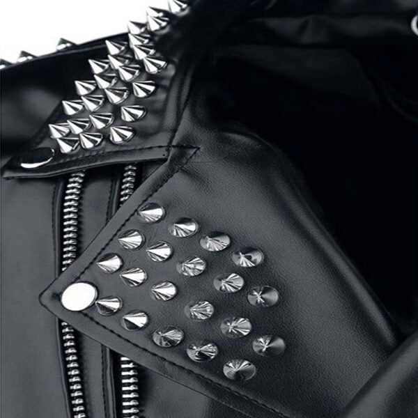 Borchie argentate su spalle, risvolti e schiena, insieme a maniche trapuntate e cerniere YKK, definiscono uno stile audace e inconfondibile.