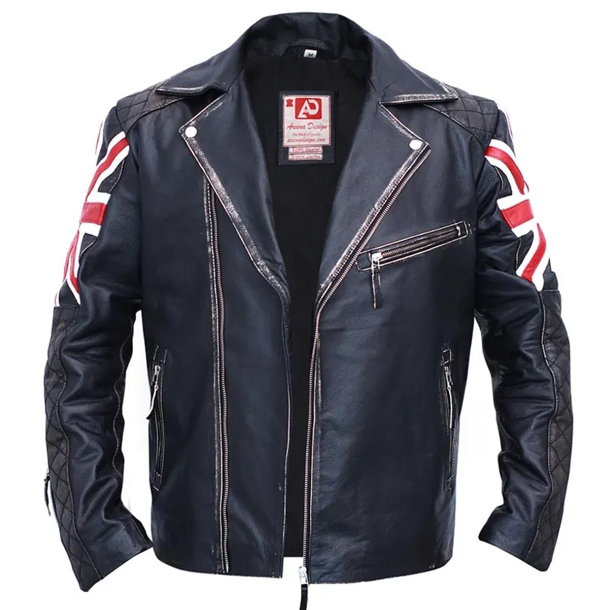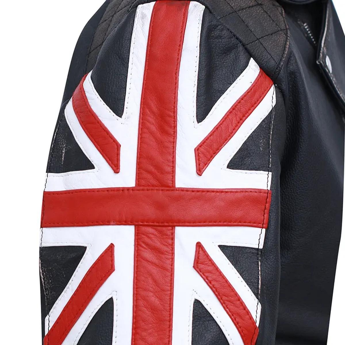 Giacca Biker in Vera Pelle Nera Vintage con Bandiera UK