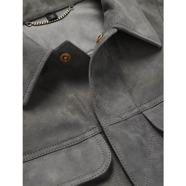 Questa giacca da camionista in pelle scamosciata slim fit è un vero piacere da indossare, amata da uomini di ogni età. Realizzata in pelle scamosciata grigia di alta qualità, è semplice ma al tempo stesso elegante e alla moda. Il suo design è pensato per la vita quotidiana, con un colletto stile camicia e una pratica chiusura a cerniera YKK.