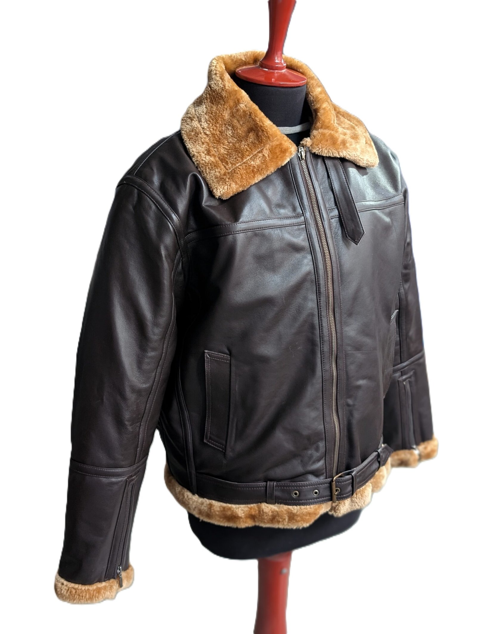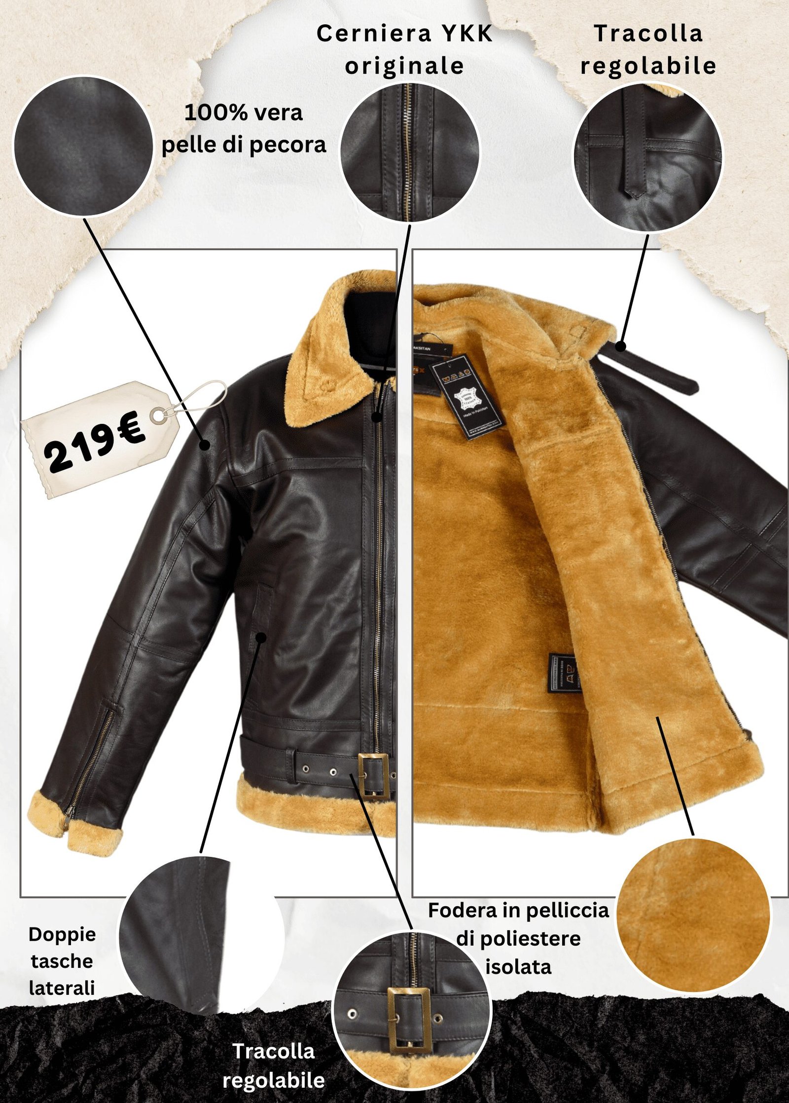 Ogni giacca è realizzata con una selezione pregiata di vera pelle di pecora di grado A. La pelle esterna è trattata per resistere all’usura e sviluppare una patina unica nel tempo. L’interno è foderato con una fodera in pelliccia sintetica di nuova generazione, densa e morbida, che fornisce un’impenetrabile barriera termica contro vento e umidità.