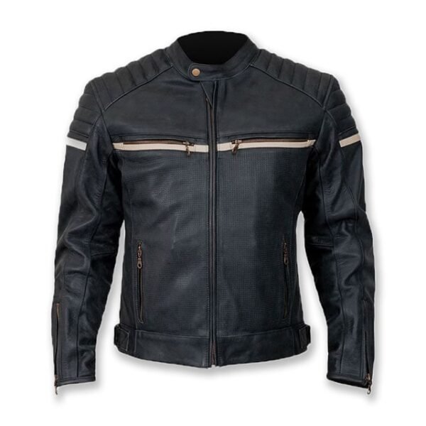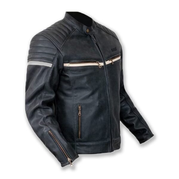 Colletto a fascia con bottone automatico, spalline trapuntate e cerniere metalliche robuste che conferiscono un look grintoso e distintivo, fedele allo stile biker classico.