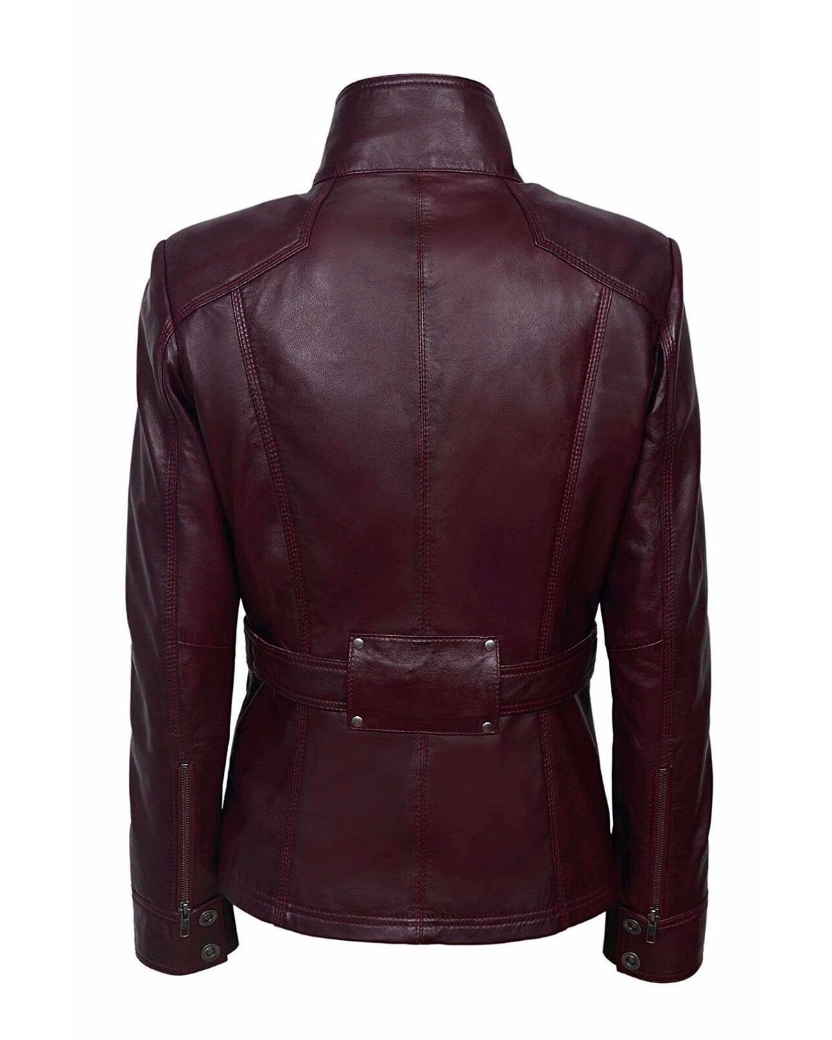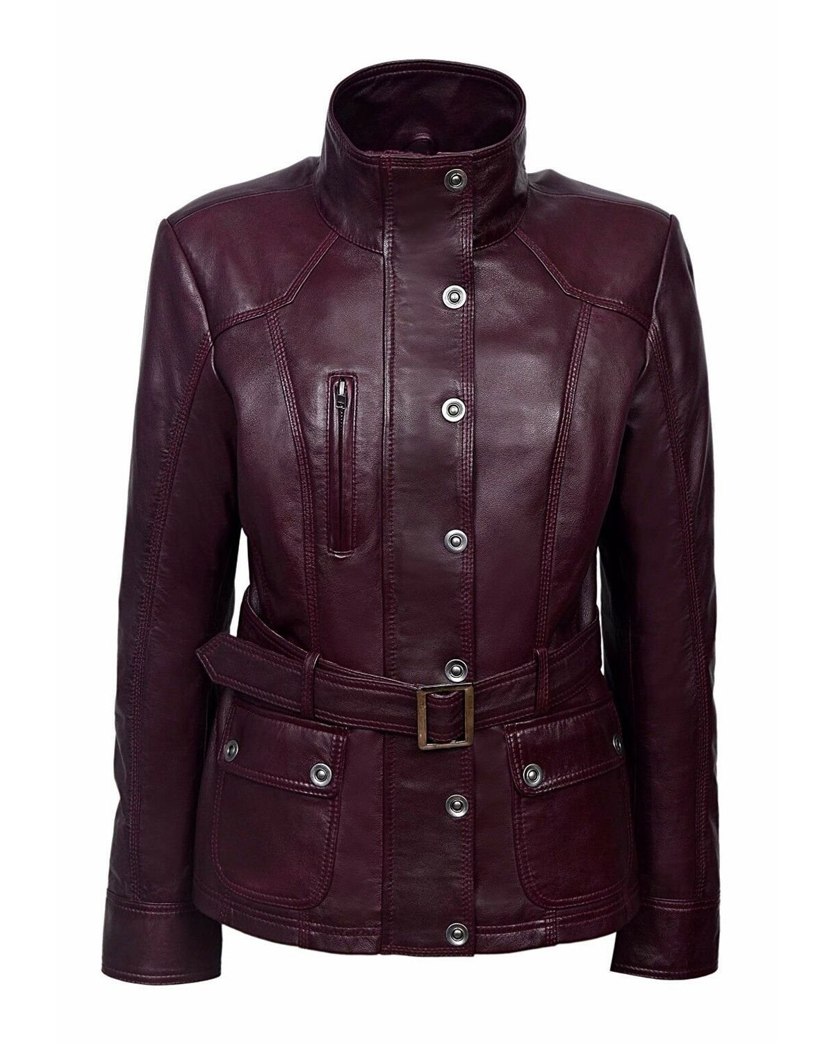 La fusione tra la chiusura frontale con zip e i bottoni, unita alla versatilità dei polsini con zip e linguette, rende questo capo veramente unico. L’originale colorazione Ciliegia Prugna e la vita regolabile con fibbia esaltano una silhouette femminile e decisa.