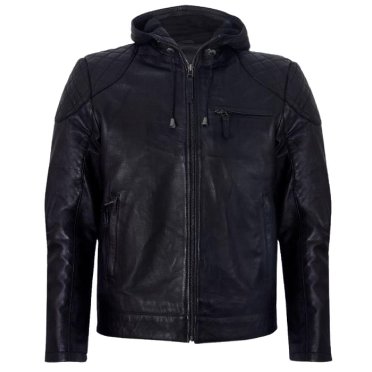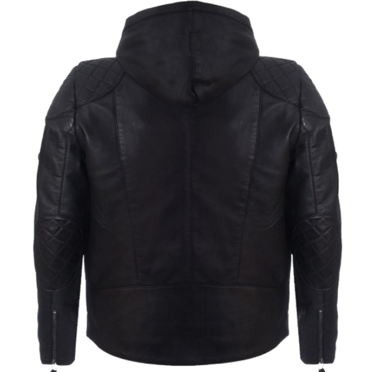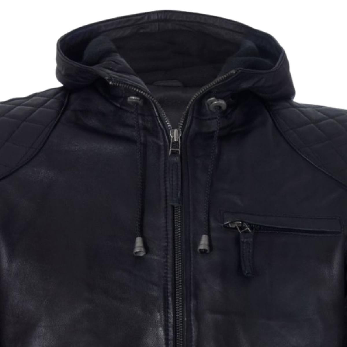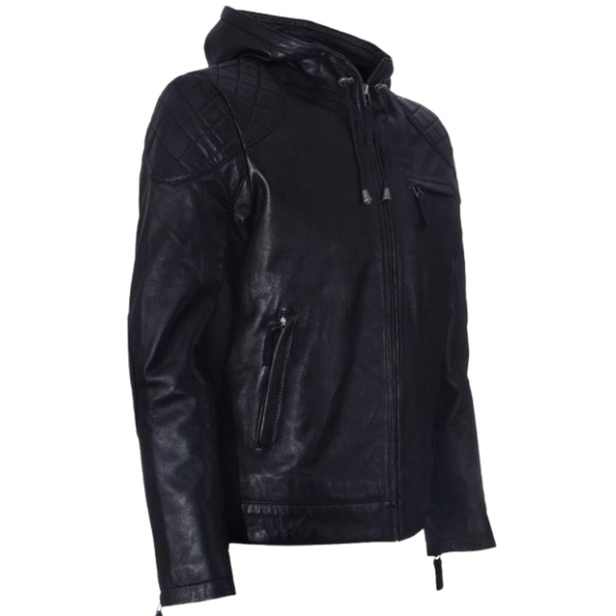 Giubbotto bomber con cappuccio in pelle nera da uomo